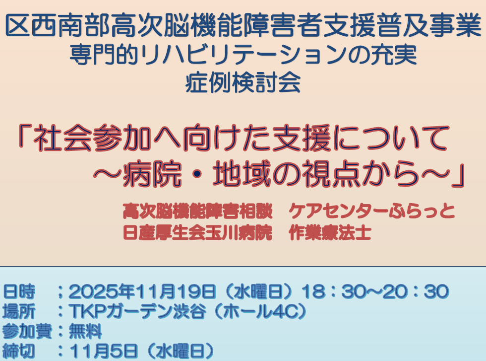 地域における高次脳機能障害の専門窓口となり、個別の相談支援、区、関係機関等の行う支援に対する助言および情報提供を行う。